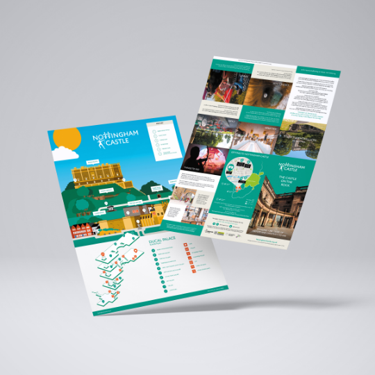 Ahead of its relaunch, Nottingham Castle commissioned our team to create a suite of marketing materials for visitors to engage with when visiting this iconic destination – including an illustrated map, visitor leaflet, wayfinding hoardings, signage and branded templates.